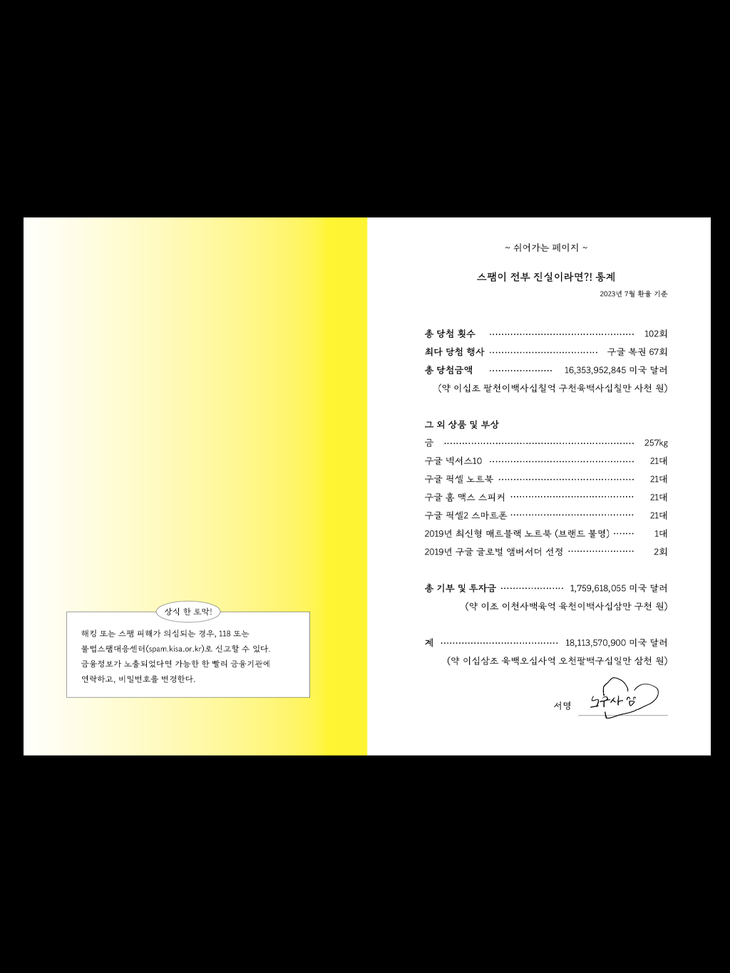 수집기간 982일, 총 708통의 스팸 메일, 총 상금 23조 원에 달하는 방대한 기록! 차마 휴지통으로 보내지 못한 108통의 스팸 메일을 소개한다. 스팸 메일의 역사를 짚고 다섯 가지로 분류한 스팸의 유형을 하나씩 살펴보며, 웹 언어로 진화하고 또 사라져가는 스팸의 모습을 기록했다. 스팸 메일이 비추는 또 다른 세계는 어떤 모습일까? 위험하고 우습지만 어딘가 슬픈 유해의 장(場), 스팸 메일의 세계를 탐색한다.