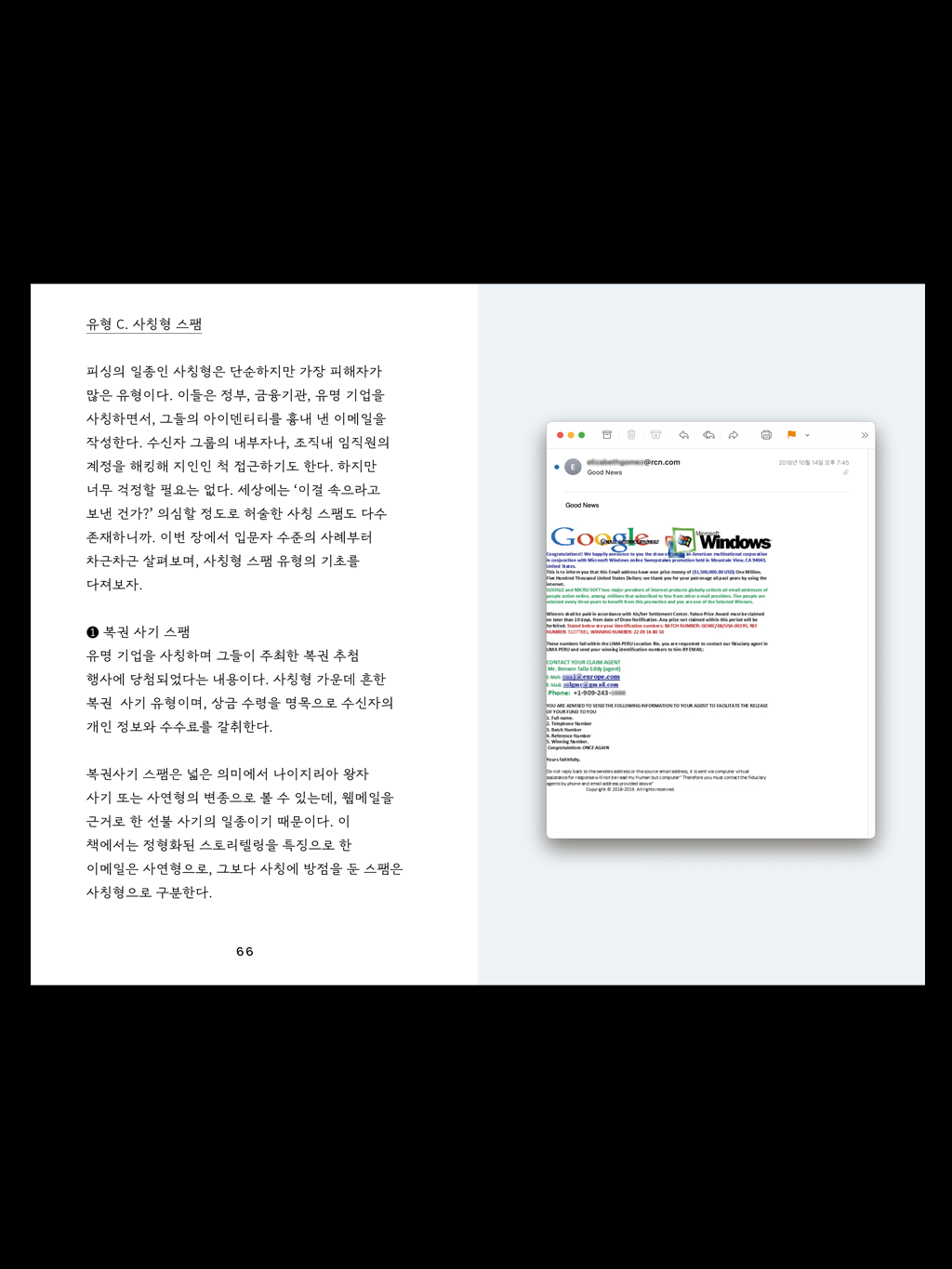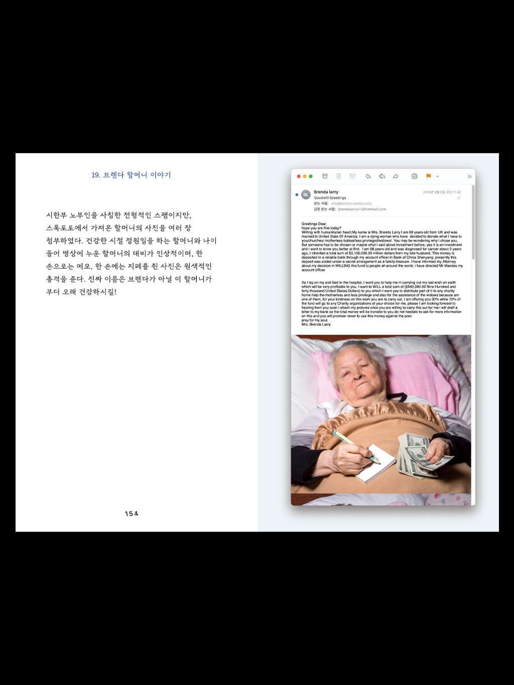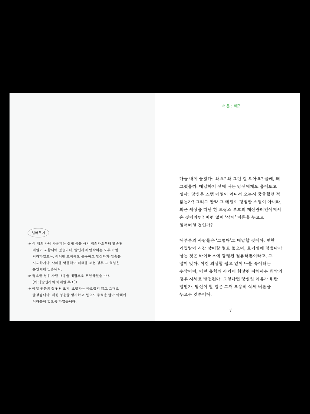 “3년간 스팸 메일을 수집하며 내게 중요했던 것은 메일의 진실 여부가 아니었다. 그것이 어떤 거짓말을 하고 있는지, 위장에 능한 포식자처럼, 스팸 필터를 뚫고 수신자에게 가닿기 위해 어떤 과정을 거쳐왔는지. 생물처럼 진화하는 그것들을 분류하고 들여다보는 일이었다. 가끔은 너무 오래되어 낡고, 더 이상 알아볼 수 없게 된 메일들이 수신함에 도착한다. 속이 빤히 들여다보여 우수울 지경인 속임수들도, 더 이상 로드되지 않는 이미지들도. 이들은 얼마 안가 웹에서 멸종할 것이었다. (...) 나는 어느새 수백 통의 스팸이 모여있는 메일함을 바라보며 생각했다. 그건 좀 애석한 일 아닌가. 누군가는 내가 그랬듯 알고 싶어하지 않을까. 이 위험하고, 우습지만 어딘가 슬픈 사이버 유해들을.”